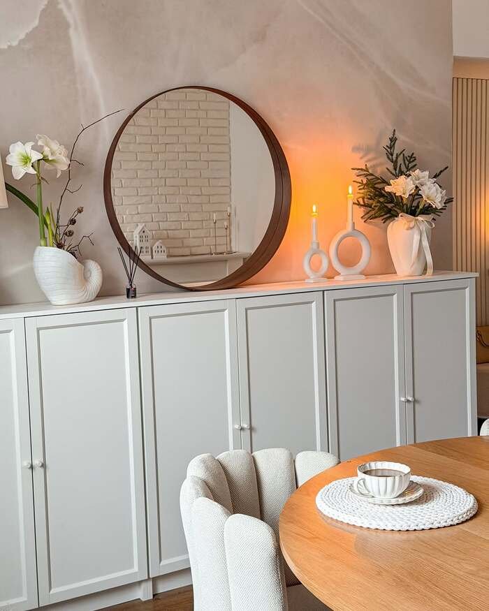 This one is calm. Like, “I just did my skincare routine” calm. The buffet is light gray with simple doors, and there’s a big round mirror leaning on top. The decor is mostly white vases and soft candles, plus a warm light that makes everything feel cozy.