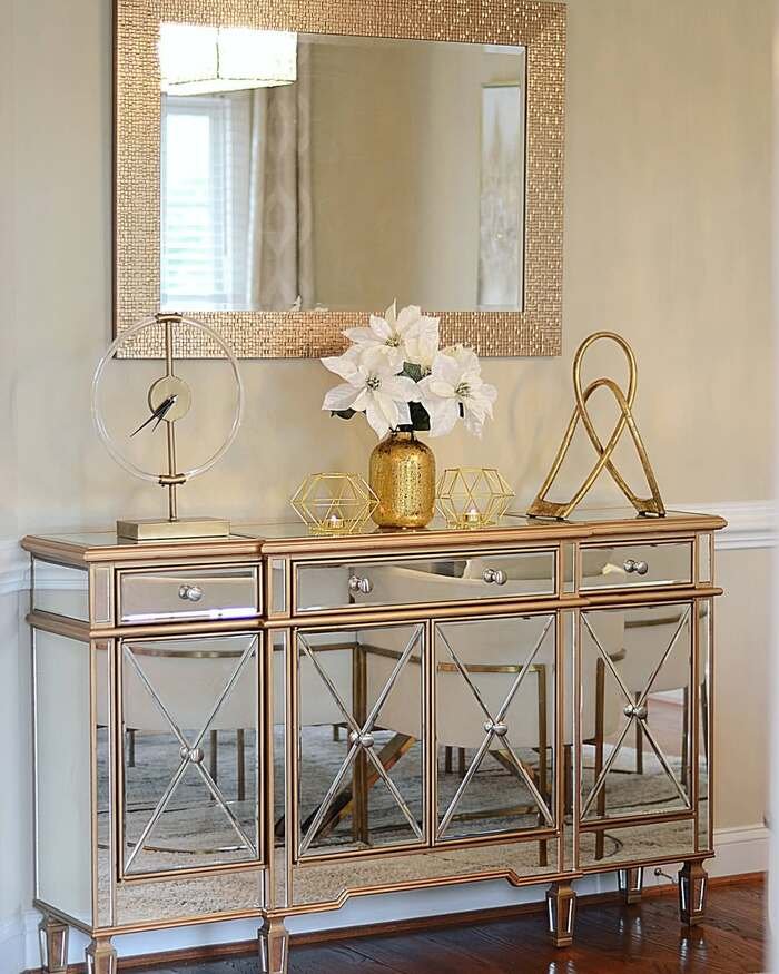 I’m not gonna lie, mirrored furniture can be scary, because it can go “Vegas hotel lobby” real fast. But this one is classy. The mirrored doors have geometric lines, the frame is champagne-gold, and the decor on top is simple: a vase, a modern clock, and a gold sculpture. Clean and shiny.