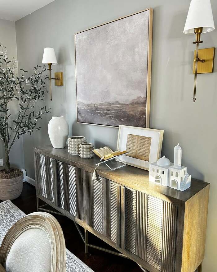 This buffet is all about texture. The doors have a ribbed or slatted look, and the wood tone is warm but not orange. On top there’s large art, a couple vases, and a few framed pieces leaning casually. It feels expensive, even if it wasn’t.