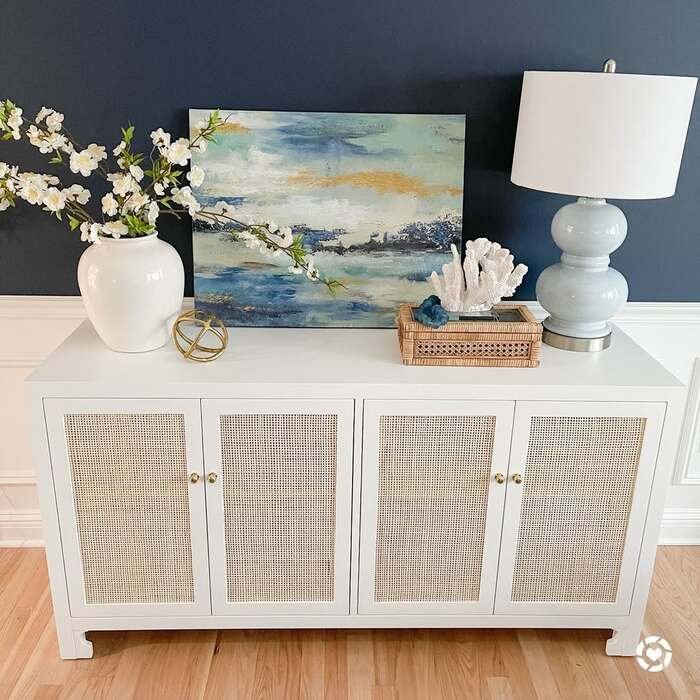 This one is so pretty and fresh. White buffet, cane-style door panels, and a deep dark wall behind it. The contrast is the whole point. Then on top there’s a lamp, a big art piece leaning, a white vase with flowers, and a small tray with something coral-like. It looks breezy but still grounded.