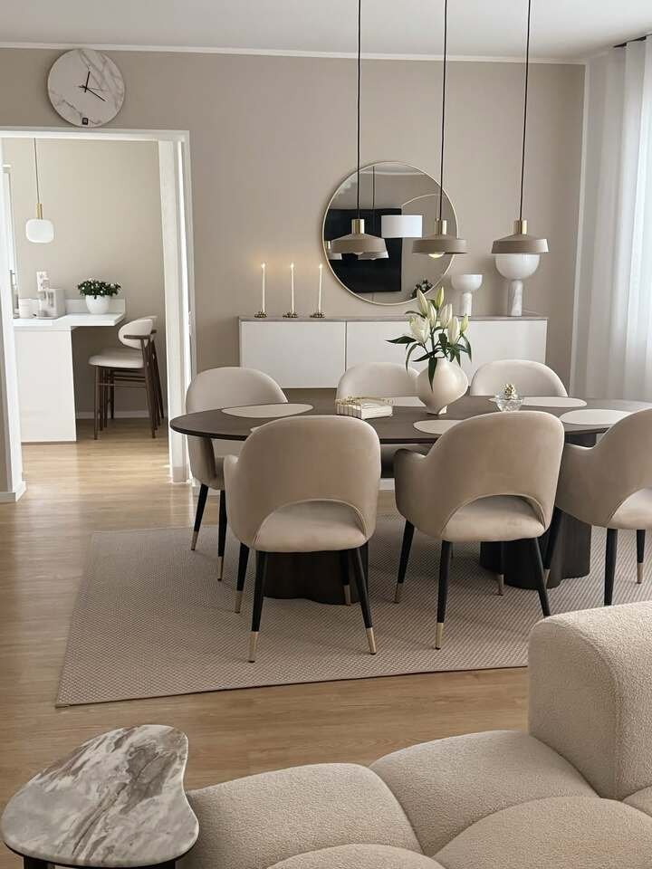 This first setup is all calm beige, creamy white, and soft gray, and it just feels like a deep breath. The oval dining table keeps the room from feeling stiff, and the chairs are plush and curvy like they’re giving you a hug. I’m weirdly into that round mirror over the sideboard too. It makes the wall feel bigger without adding clutter.