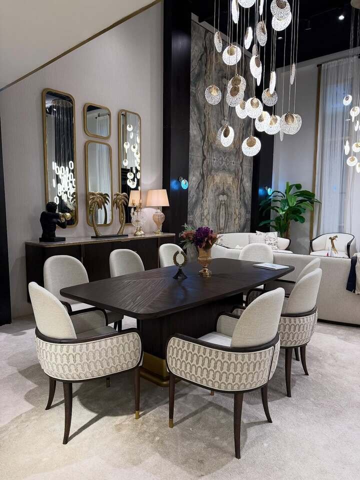 This room is the fancy one. The chandelier is like a cluster of glowing jewelry, and the chairs have patterned fabric that feels rich. There are mirrors on the wall that bounce light around, plus a tall stone slab feature that screams “designer did this.” It’s bold dining room decor ideas modern, and it’s honestly kind of dreamy.