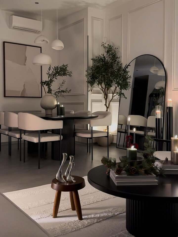 This room feels like the lights are always set to “after 8pm.” The black round table, the soft cream chairs, and that huge arched floor mirror makes it feel dramatic but still calm. I love how the mirror leans instead of being hung. It looks casual, like somebody was tired and just set it there, but it works. And the candles everywhere? Yeah, I’m guilty, I’d copy that immediately. It’s one of those dining room decor ideas modern that makes normal Tuesday dinner feel like a whole event.