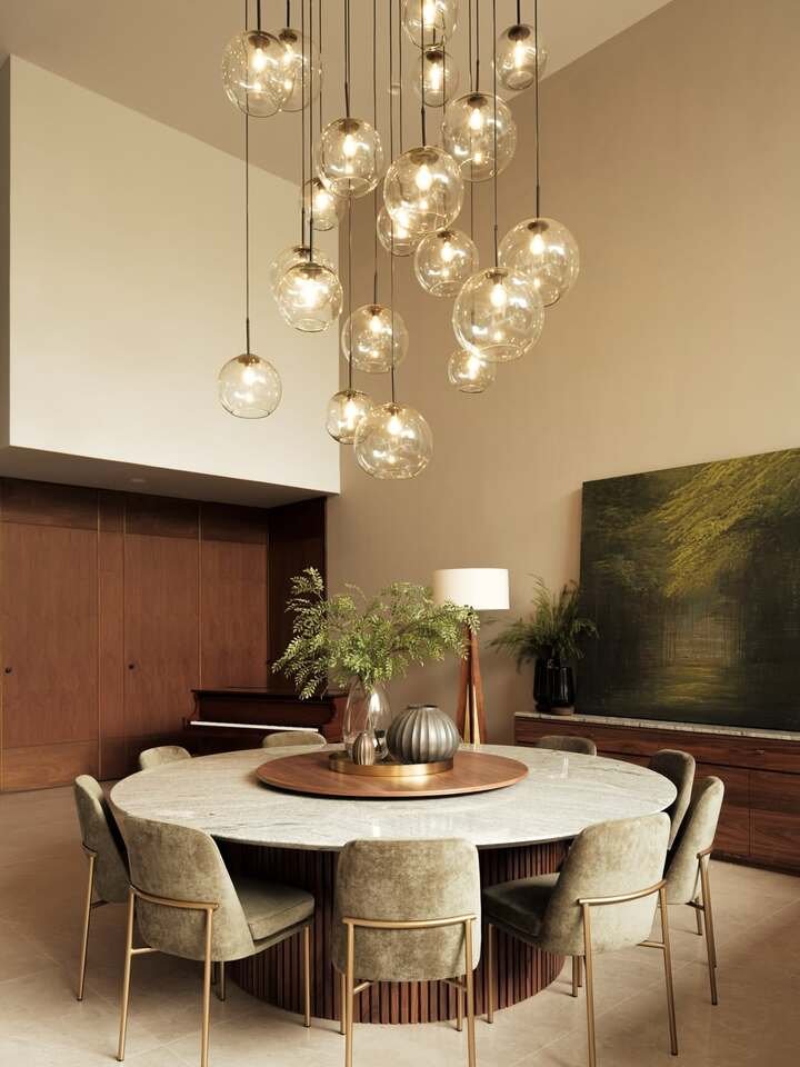 Okay this one is straight-up fancy. That cluster of glass globes hanging high feels like floating soap bubbles, and I can’t stop staring at it. The room has tall ceilings, warm wood walls, and a big round dining table that looks like stone or marble. Then there’s a wooden center piece, like a giant lazy susan, holding vases and greenery. It’s one of those dining room decor ideas modern that looks expensive, but the good news is you can steal the concept without copying every single thing.