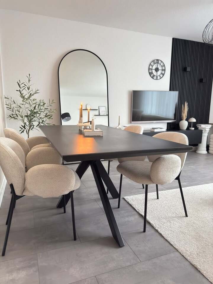 This setup is sharp but not harsh. The matte black table is long and clean-lined, and the chairs are light and rounded, almost like little clouds on skinny legs. That contrast is what makes it feel so modern. There’s also a big arched mirror again, plus a black slat accent wall near the TV area. It’s one of my favorite modern dining room decor ideas because it feels current but still practical.