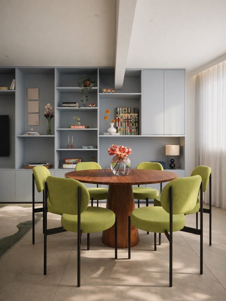 This one hits different because the wall is doing the heavy lifting. The built-in shelving in that muted blue-gray feels clean but still homey, like a place where life happens. Then the chairs come in with that green color and suddenly the room has personality. It’s a modern dining room decorating idea that still feels warm.