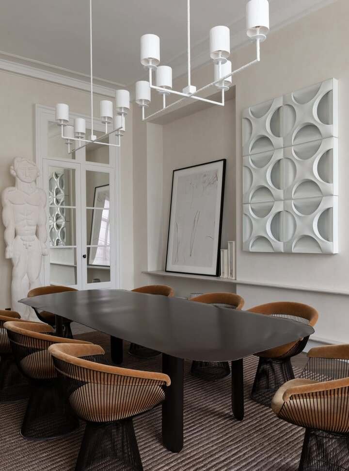 Dining room decor ideas modern with a black table, sculptural wall art, and cane chairs
