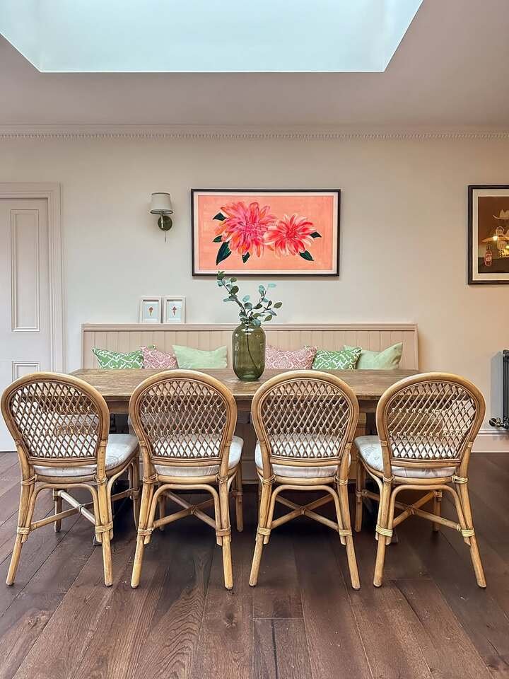 If you want dining room decor ideas modern but not cold, bring in natural materials. Rattan, wood, linen curtains, and a big glass vase. Then add one loud piece of art, like that bright floral print. It makes the room feel lived-in and not like a showroom.