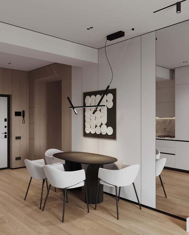 This setup is super clean. Round table, black base, simple white chairs, and one piece of art that doesn’t yell. I like how the light fixture is modern and a little edgy, but the rest stays quiet. It’s the kind of room that makes you stand up straighter, in a good way.