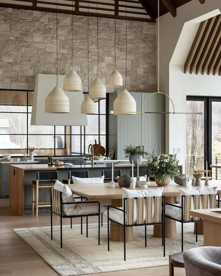 This one is grand but still comfy. There’s a stone wall, big windows, and those oversized pendant lights that hang like clay jars. The dining table is long and pale, and the chairs have cushions that basically whisper “stay for dessert.” It’s modern dining room decor, but it’s also farmhouse-ish in a calm way.
