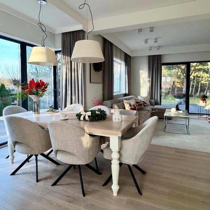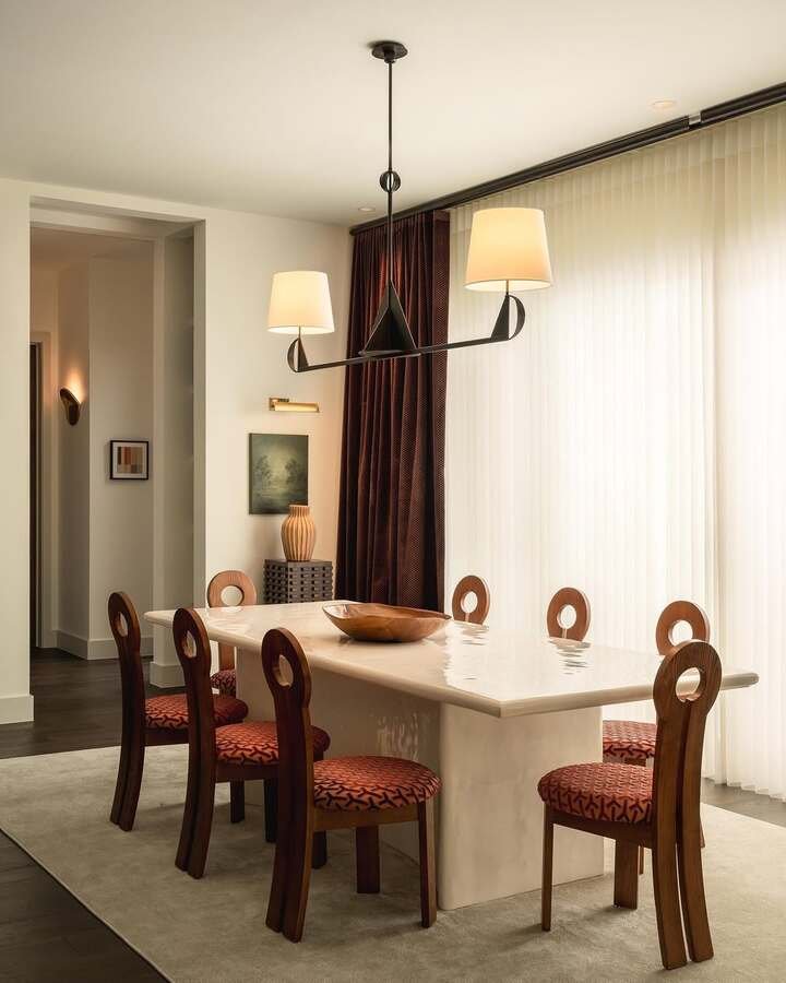 This one feels like a cozy hotel lobby but in your house. The table is light, almost like stone, and the chairs are wood with that cutout detail on the back. The whole room glows because the curtains are sheer and the lighting is soft. I’m not gonna lie, I’d sit here just to drink water and pretend I’m fancy.