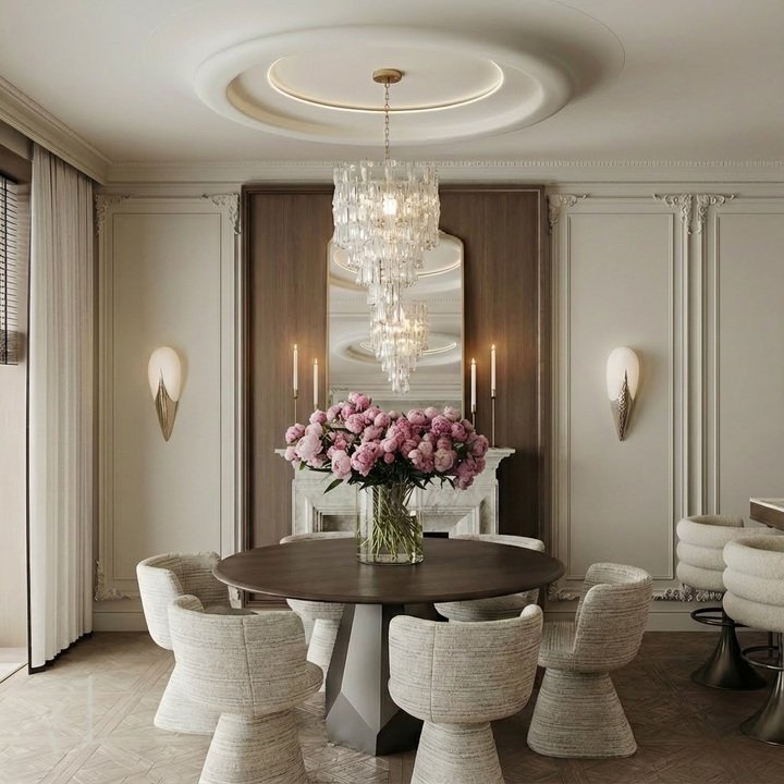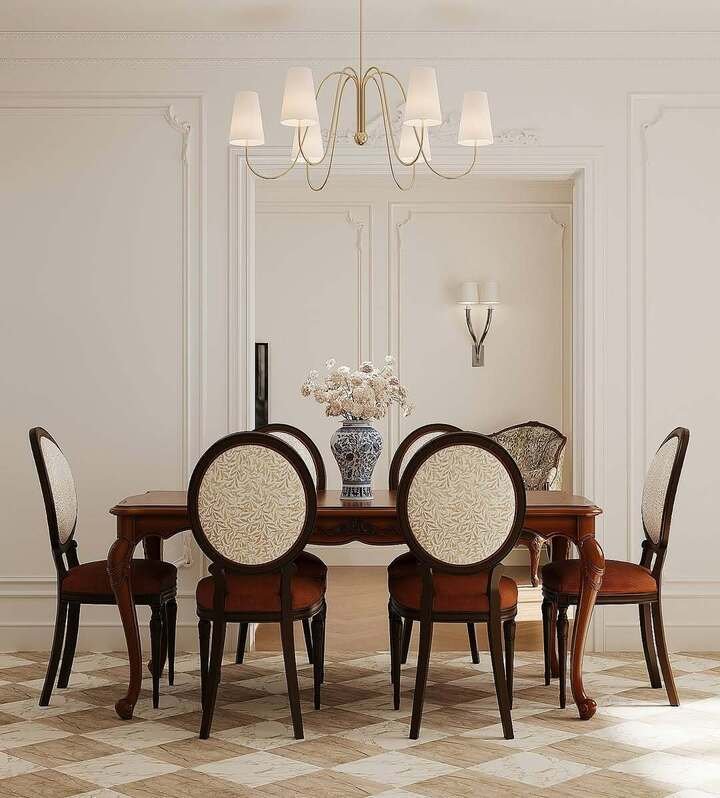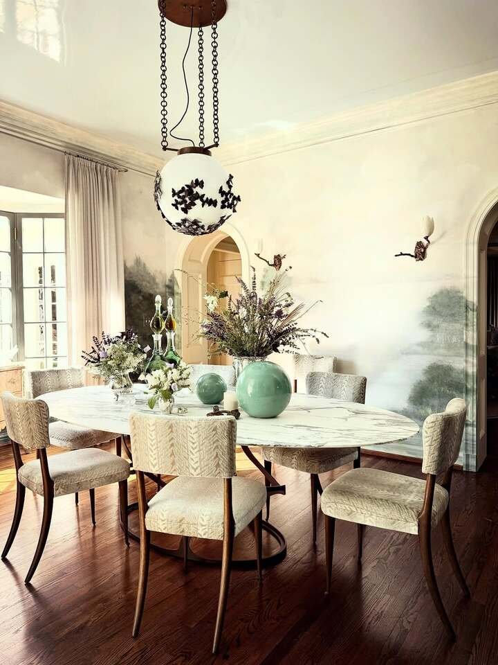 This style is all about mixing old and new to create a balanced, harmonious space. Don’t be afraid to pair antique furniture with contemporary light fixtures or abstract art. The contrast will keep the room from feeling too stuffy or outdated. Additionally, using materials like velvet or silk for upholstery and pairing them with classic wood gives the room an upscale yet inviting vibe. Add a statement chandelier to really draw attention and give your dining room a touch of glamour.
