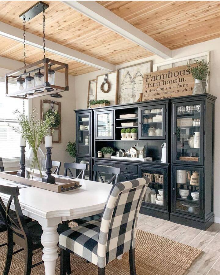 This first one is all about rustic charm with a little modern twist. Picture a cozy dining area where everything just feels warm and inviting. The wooden beams on the ceiling? Classic farmhouse style. Then, you've got the black cabinet that stands tall, filled with plants and decorative pieces. The chairs add a perfect contrast with their black-and-white checkered design, which brings a bit of fun and pattern to the mix. It’s not too overdone; it’s just enough to make you feel like you're in a countryside retreat every time you sit down for a meal.