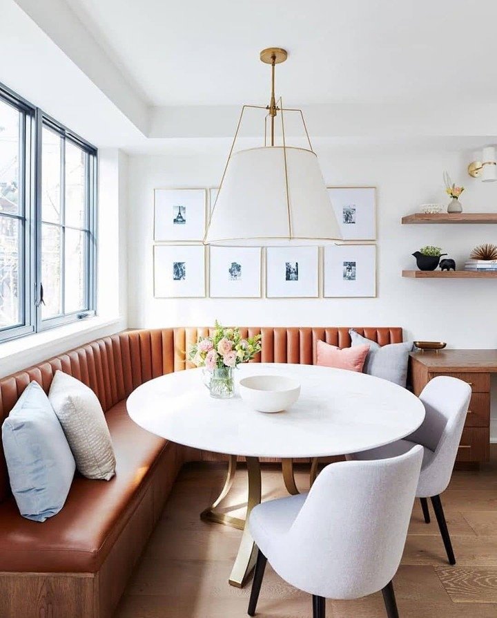 Imagine being able to sip your morning coffee in a space that feels like a hug. This design is all about comfort and coziness, with a modern, clean twist. The booth-style seating is what really makes this space stand out. The brown leather upholstery? It’s not only super comfy, but it also adds a warmth that pairs perfectly with the soft, neutral tones of the rest of the room. And the circular table? It adds a sense of intimacy, making you feel like you’re having a private dinner, even if it’s just you and a friend.