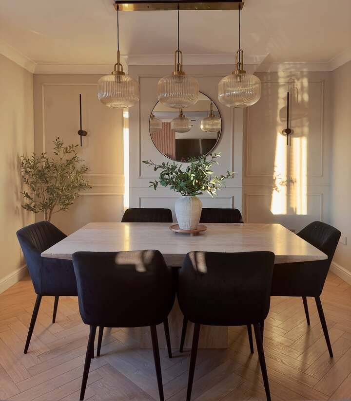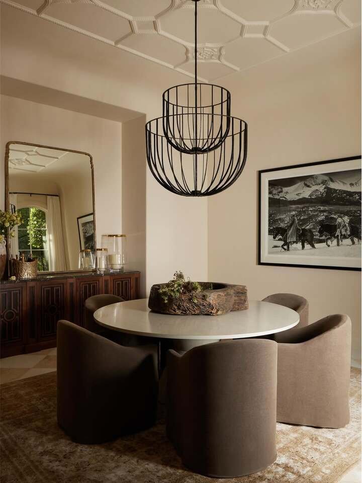 You might notice the combination of classic design elements, like the heavy vintage mirror, with the more modern details, like the stark, geometric light fixture. This room achieves that perfect balance between a timeless aesthetic and contemporary style. It’s the kind of dining room where you could invite friends over for dinner and immediately feel like you’re hosting at a fancy restaurant—but in the comfort of your own home.