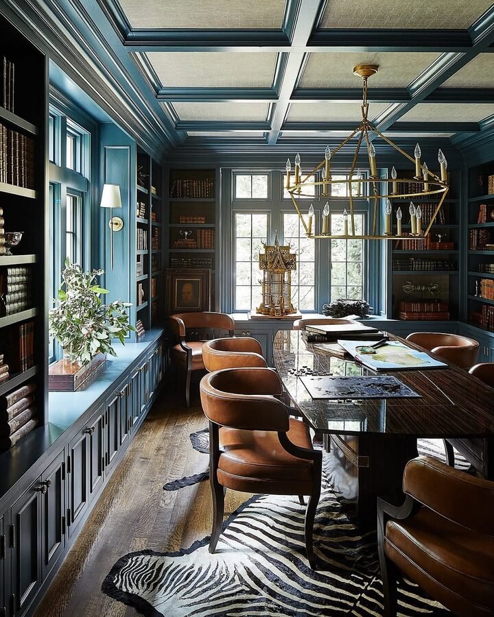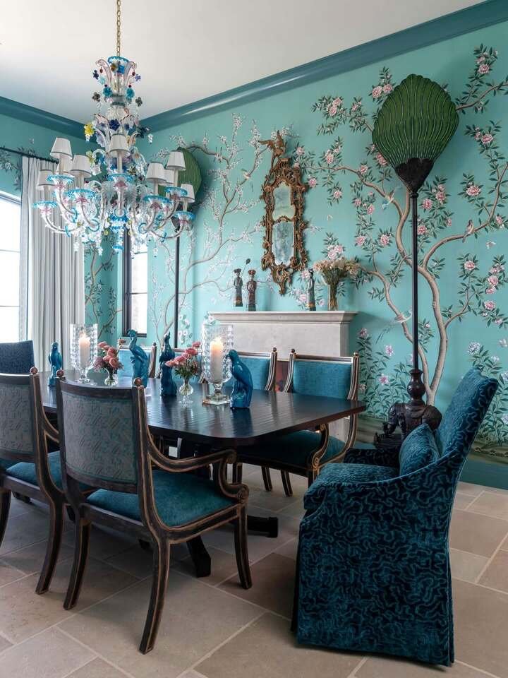 Okay, so if you're a fan of bold color, this next dining room is going to blow your mind. The teal walls alone are enough to stop you in your tracks! But it's not just the color that makes this room pop. The chandelier is absolutely stunning—it's like a piece of art on its own. The floral wallpaper and bright, lush furniture bring a sense of drama, but it’s done in a way that feels elegant and not overdone. The dark wood table with its carved details contrasts beautifully with the luxurious lighting and the unique, colorful chairs.