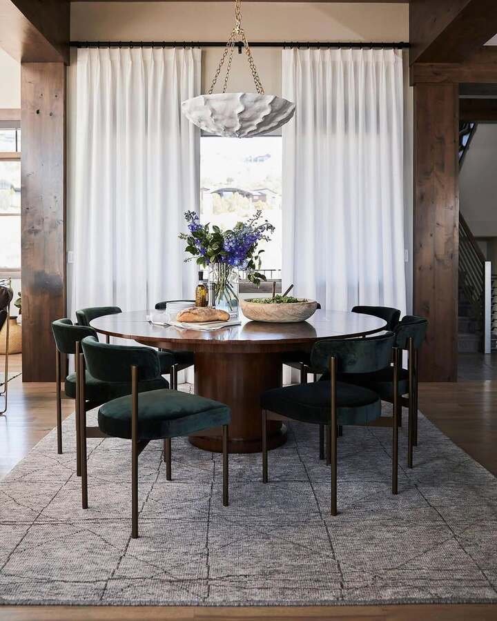 If you're looking for a space that balances sophistication with natural warmth, this dining room is a perfect inspiration. The deep green velvet chairs against a wood circular table feel rich yet inviting. The soft lighting coming from the textured pendant light adds a cozy vibe to the entire room. The large windows covered in neutral-toned curtains allow natural light to flood in, bringing life to the earthy tones of the room. This is a dining room that embraces both comfort and elegance. The patterned rug under the table ties the space together, and it gives the whole room a grounded, earthy feel.