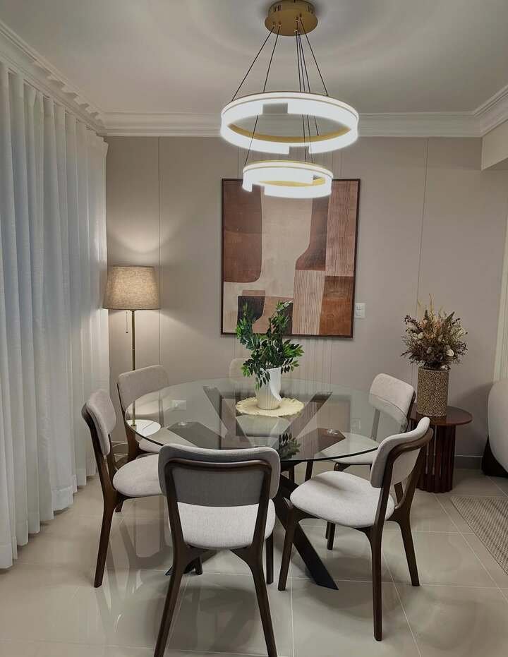 The light color scheme, with soft neutrals and the glass table, keeps the room feeling airy and spacious, even if it’s on the smaller side. If you enjoy modern luxury but want to keep it light and breezy, this design is ideal for creating an upscale dining space that still feels relaxed and open.