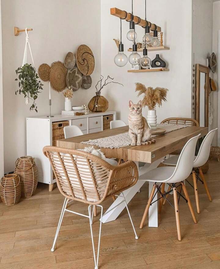 Natural materials like wood, wicker, and stone can really bring warmth to a dining room. To pull this off, opt for earthy tones and embrace the beauty of imperfections—wooden tables with visible grains or wicker chairs with a bit of texture. This style is perfect for anyone who wants a relaxed yet stylish dining room that feels close to nature.