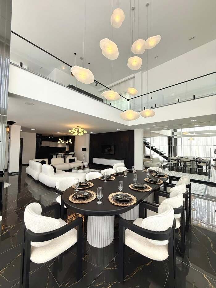 Last but not least, we have a monochrome dining room with a luxurious twist. The black and white color scheme creates a striking contrast, while the plush white chairs and gold accents add a sense of opulence. The chandelier is the star of the show, drawing the eye upward and enhancing the sophisticated vibe of the room.