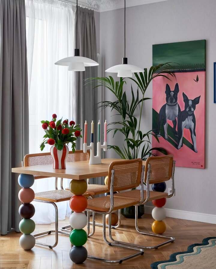 If you want to copy this vibe, keep the big things simple and let one thing be weird. The tabletop is plain wood, the chairs are woven, and the walls are calm. That’s why the colorful legs don’t feel chaotic. My tip is to repeat one or two of the leg colors somewhere else, like in a small vase, a candle, or a piece of art. It makes the “random” feel planned.