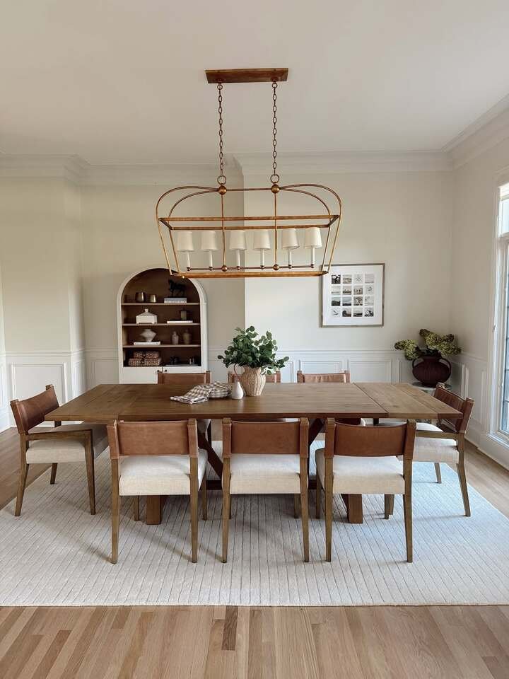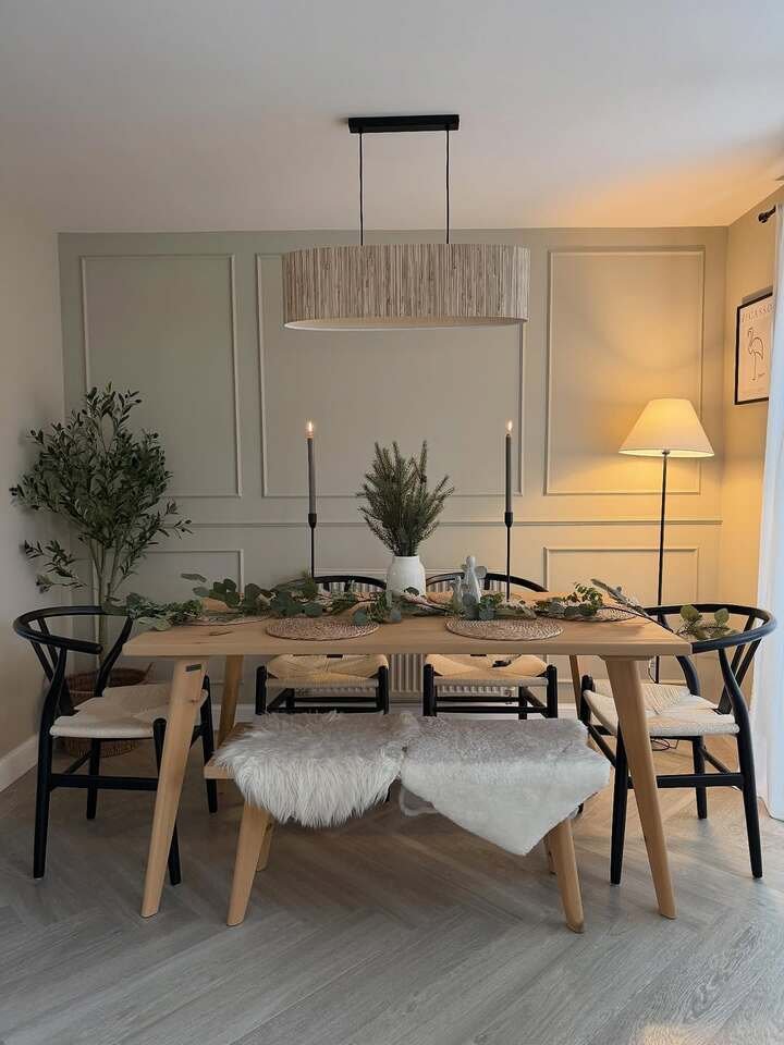 Panel molding is such a cheat code. It makes plain walls look expensive, even if you DIY it. The table styling is minimal, but still warm with greenery and natural textures. And I love the mix of chairs and a bench, it feels relaxed and real.
