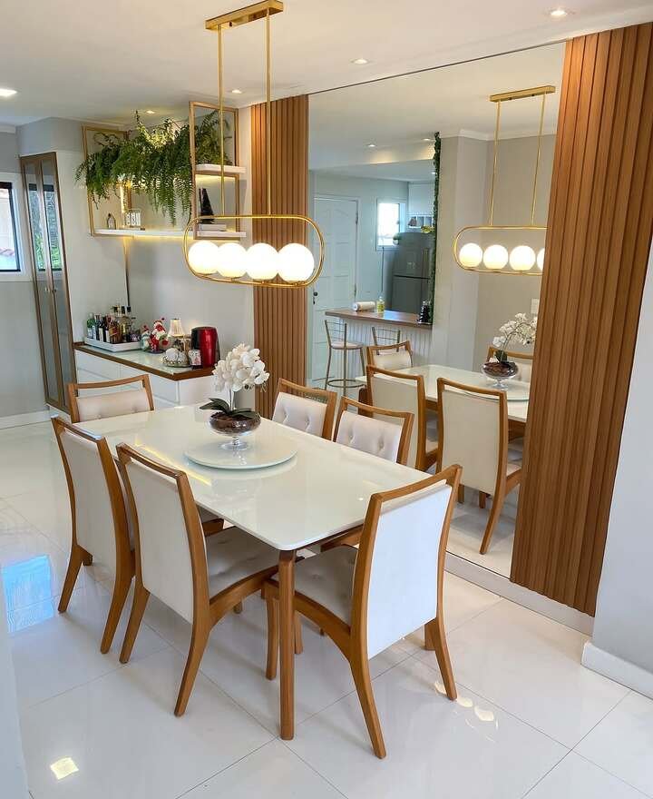 If you want to copy this classy modern dining room decor, here’s the trick: keep the big stuff simple, then add one or two shiny things. Do a white table or a light stone top, then bring in warm wood tones (chairs, slats, shelving). Add a mirror to double the light, and keep the centerpiece low and calm. Like orchids, or a bowl, not a giant jungle. Also, I swear pendant lights instantly make the room feel “finished,” even if the rest is still a work in progress.