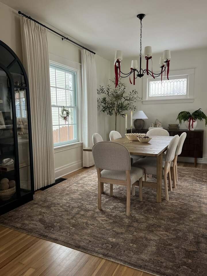 This one feels like a quiet morning. The rug under the table is huge and cozy, and the curtains are long and soft, like hotel curtains. The chandelier is classic, but those little ribbon details make it feel personal and a bit playful. It’s giving modern classy dining decor with a holiday twist, but you could do it year-round if you swap ribbons for something else.