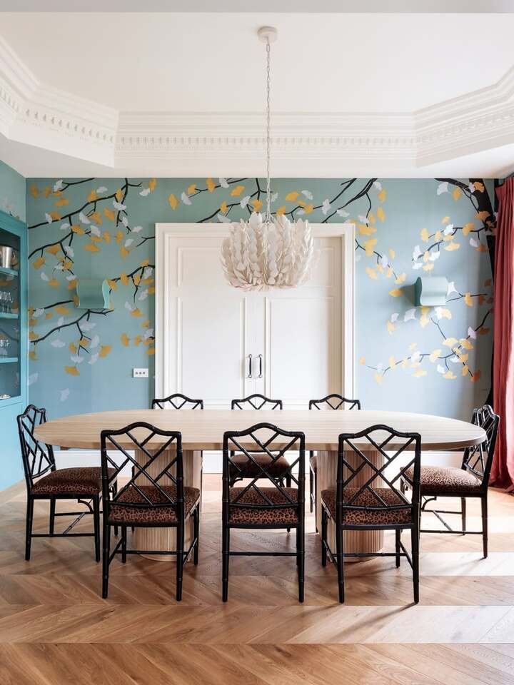 This room is straight-up charming. The wall mural with branches and soft colors feels playful, but the furniture keeps it grounded. That big oval table is smooth and modern, and the chairs have that crisscross back that looks a little classic. This is modern and classy dining room decor that doesn’t take itself too seriously, which I love.