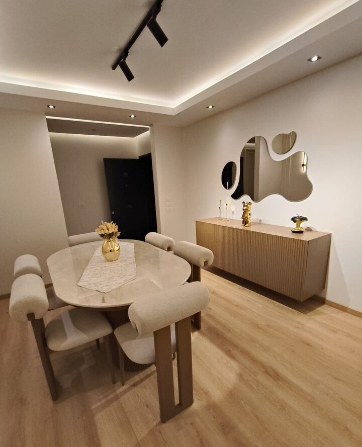 This room makes me think of city apartments where every inch counts. The round table is perfect for tight spaces, and the chairs are soft and modern. The track lighting and the clean console give it a sleek feel. That wavy mirror is such a fun detail, like it’s smiling. It’s absolutely dining room decor modern classy, but also practical.