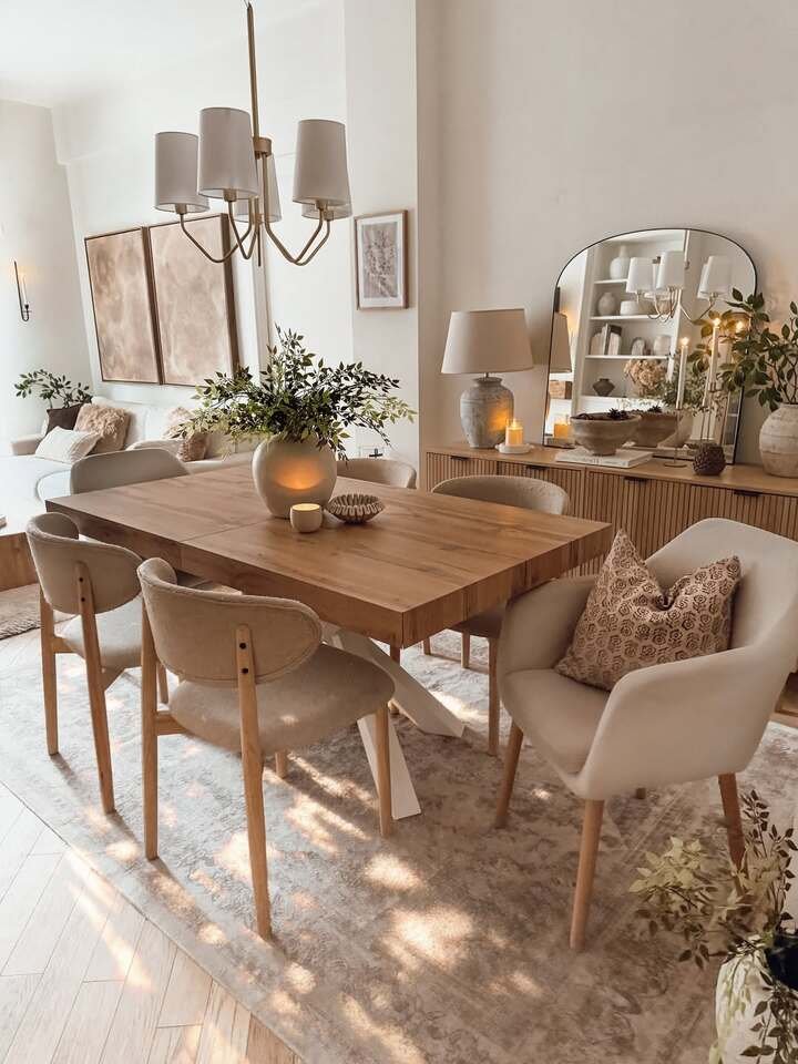 This neutral room is the kind that makes me want to light a candle at 3pm and pretend I’m a calm person. It’s soft, creamy, and warm, but it doesn’t look flat. That’s the trick with dining room decor modern classy in neutrals, you have to layer textures or it ends up looking like a blank waiting room.
