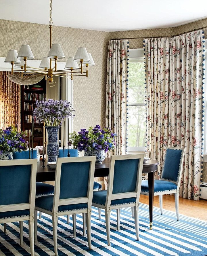 Blue chairs, floral curtains, and a classic room that still feels fresh