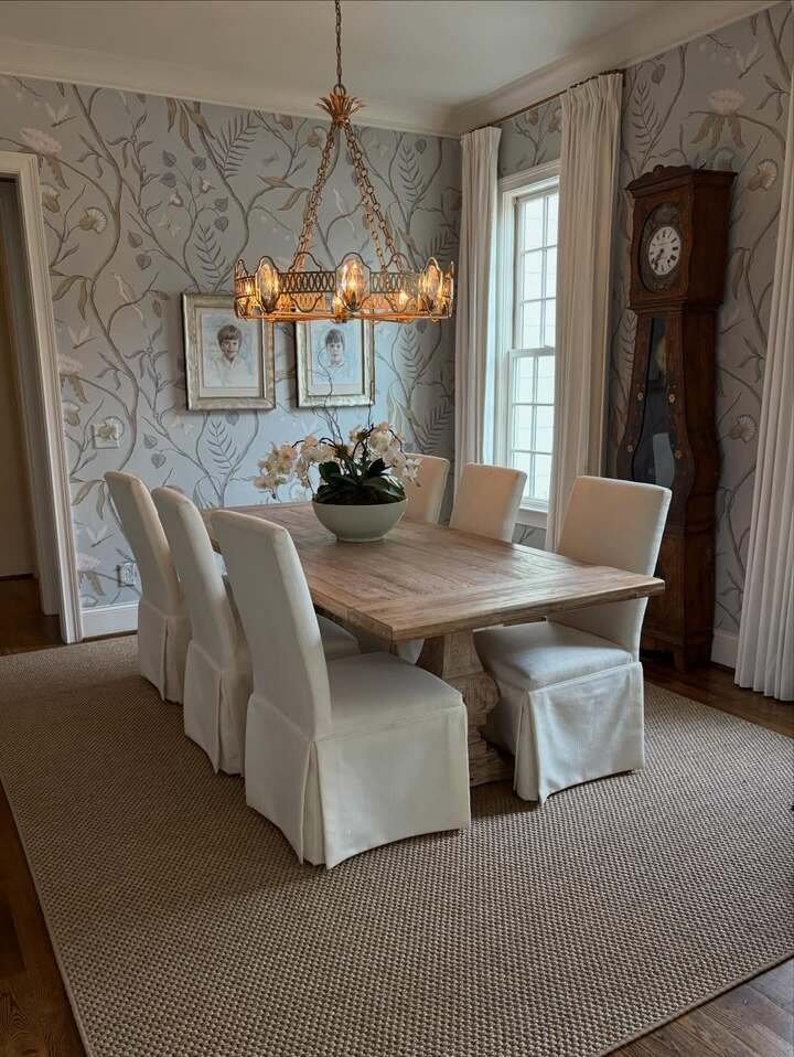 This space has wallpaper, slipcovered chairs, and even a tall old-school clock. Normally I’d think “too traditional,” but it works because the table is simple and the colors stay calm. That mix is honestly the secret sauce for dining room decor modern classy when you like classic stuff but don’t want it to feel like your grandma’s formal room.
