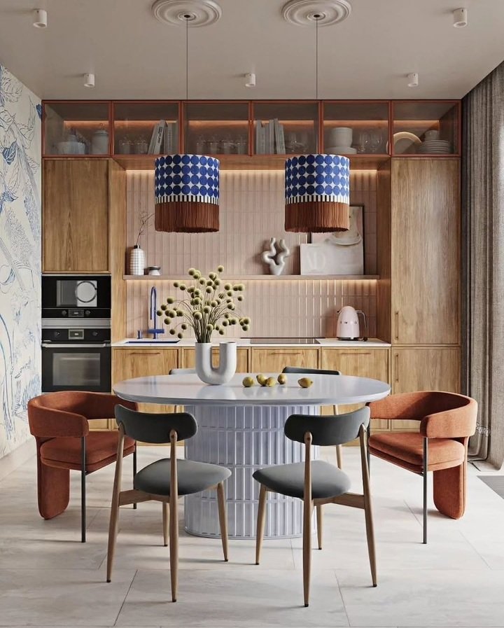 This room is so modern but still warm. Wood cabinets, an oval table, and those blue patterned pendants hanging like jewelry. This is dining room decor modern classy for open layouts where your dining area shares space with the kitchen, which is most of us honestly.