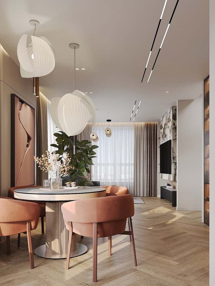 This room looks like a quiet luxury hotel, but in a way that still feels livable. The blush chairs are soft and pretty, and the giant white pendants feel like floating sculptures. This is dining room decor modern classy if you want something polished without being cold.