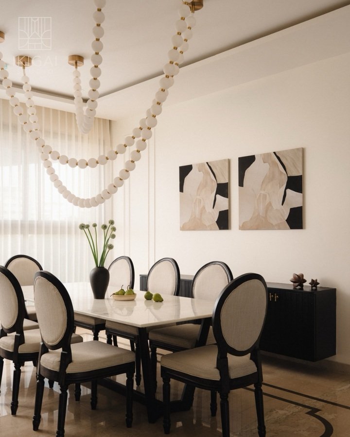 The beaded chandelier in this room is the whole moment. It’s big, sculptural, and playful, but the room stays calm because the walls and art are neutral. That’s very dining room decor modern classy behavior: one loud statement, everything else behaves.