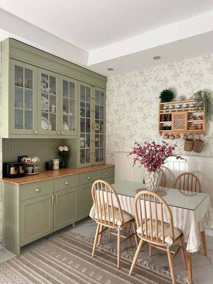 If you want this look but you’re scared, start smaller. Paint just one cabinet section, or add a bold wallpaper panel behind open shelving. For compact dining room decor, you only need one “wow” moment, then keep the rest simple so it doesn’t feel crowded.