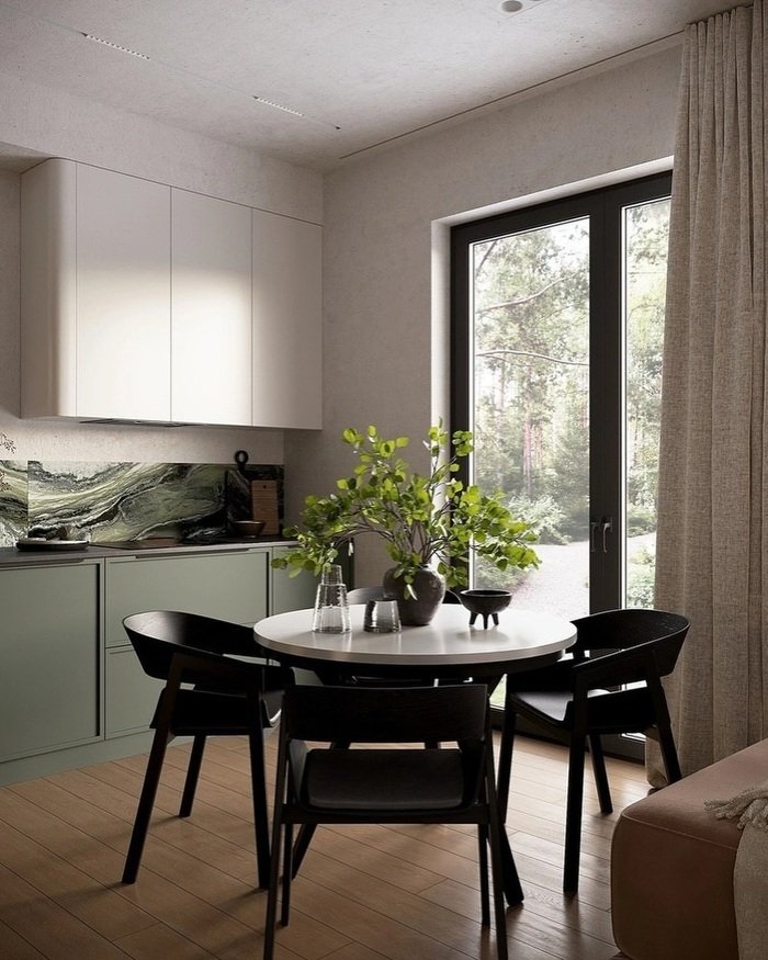 This is such a good solution for small apartments where the dining area is basically “wherever there’s sunlight.” The little round bistro table fits perfectly by the window, and the glass-and-black-frame divider makes the dining zone feel separate without blocking light. That’s a big deal for dining room decor small space homes, because dark spaces feel smaller.