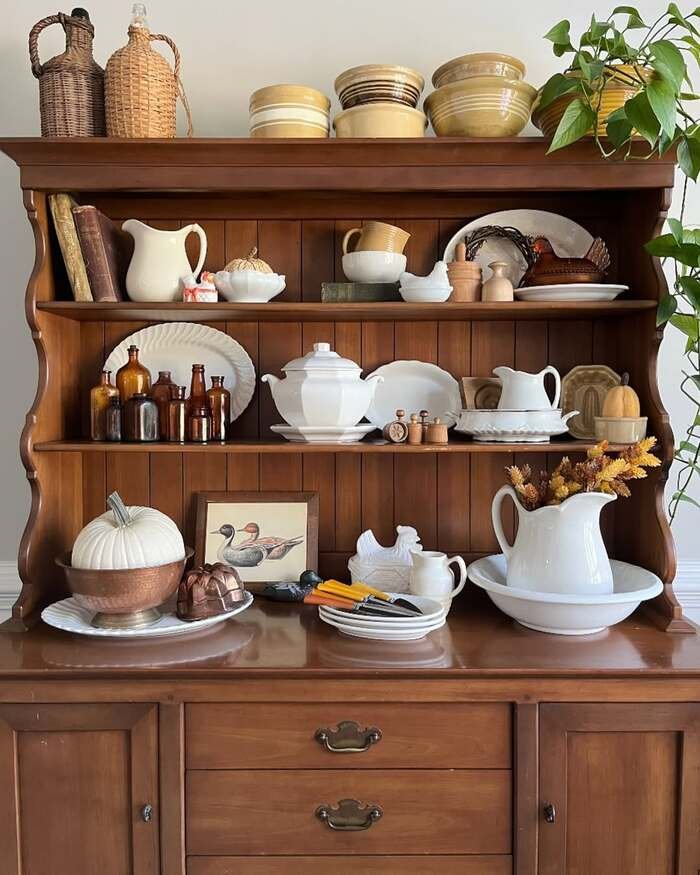 To replicate this, think about incorporating elements of nature like fall flowers and fresh pumpkins. A mix of vintage glassware and small plates on the shelves will bring the hutch to life without overwhelming it. I personally love how the fall tones in the glasses and bowls echo the warm, inviting vibe of autumn. To create the perfect balance, don’t hesitate to add some seasonal touches like woven baskets and rustic ceramics to give your hutch a country-chic feel.