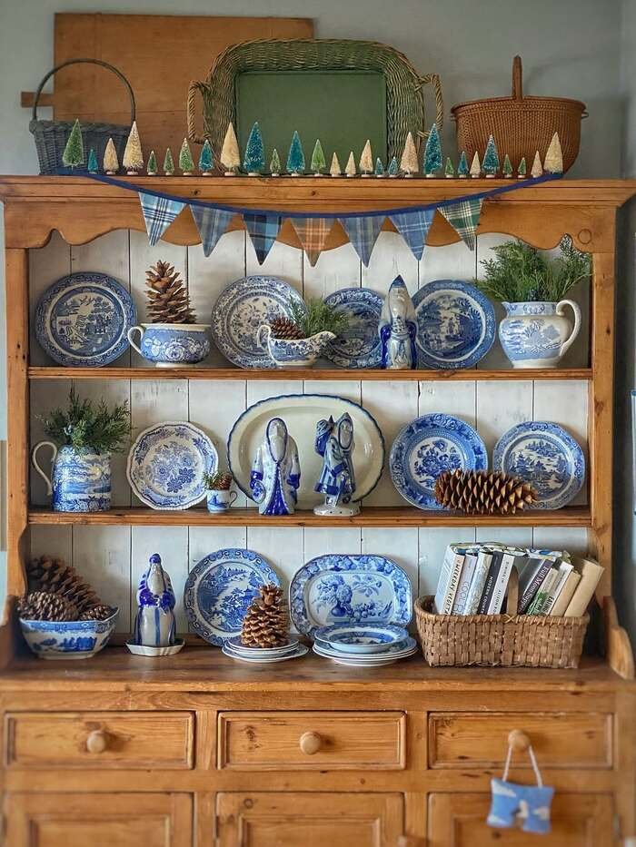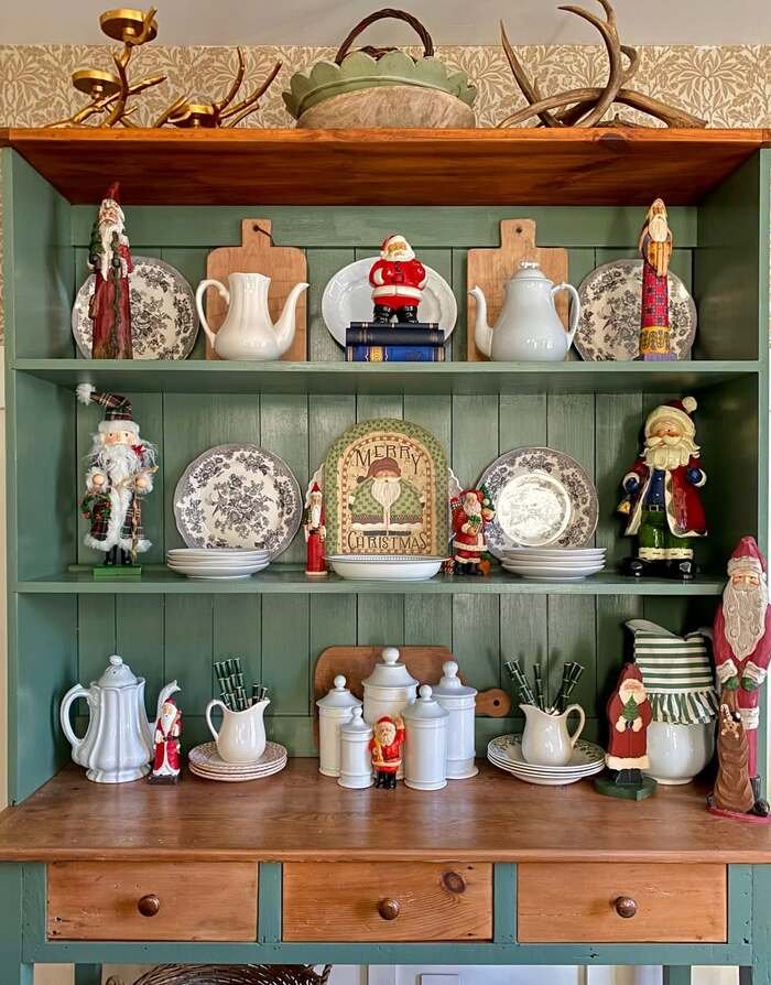 This next hutch features a delightful mix of traditional Christmas decorations, evoking a cozy, festive atmosphere. The green hutch is paired with cheerful holiday figures, like Santa and traditional holiday mugs, to create a nostalgic look that’s both inviting and charming. I love the way this design uses a combination of greenery, classic holiday plates, and little knick-knacks to pull everything together.