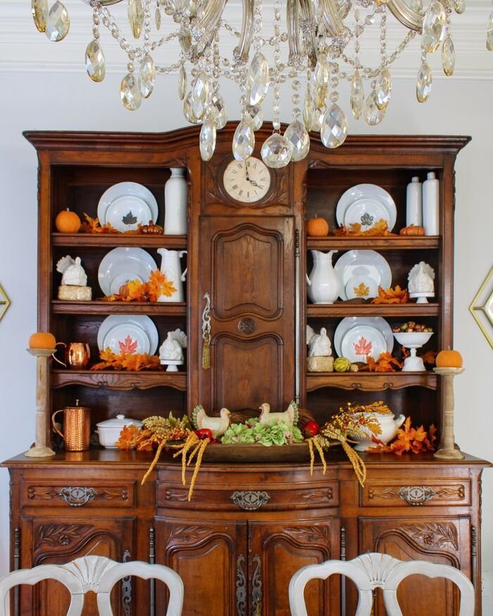 I couldn’t resist including one more hutch that embraces the autumn spirit. This hutch is overflowing with fall color—golden tones, rich reds, and browns that feel like they belong in an Instagram-worthy Thanksgiving dinner. The combination of fall foliage and classic white china is an excellent way to celebrate the season without being too over-the-top.