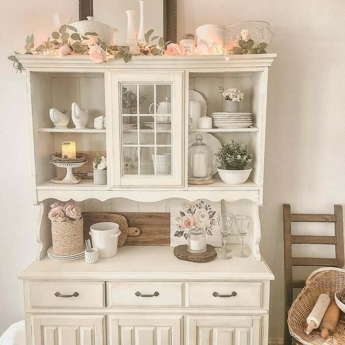 If you’re in the mood for a softer, more delicate touch, this hutch design is perfect for you. With soft pastels, floral patterns, and vintage dishes, this decor has a fresh, feminine feel. The addition of greenery and soft lighting makes the hutch feel like a peaceful oasis, perfect for those who love a light, airy vibe.