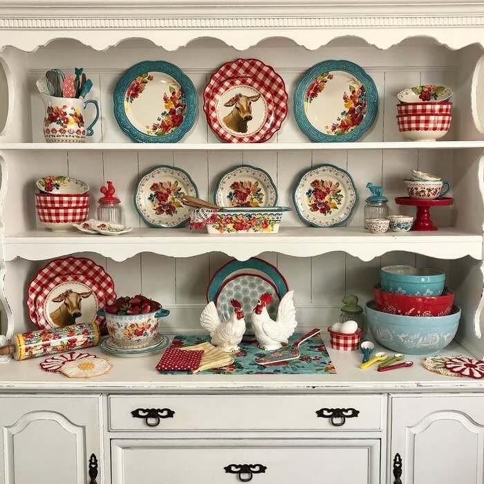 To recreate this style, you’ll want to mix different colors and patterns, like floral plates and gingham napkins, to give the space a more lively feel. Pairing bright red and turquoise dishes with vintage figurines, like the rooster and hens, will give your hutch that charming country kitchen vibe. A few floral arrangements or kitchen-themed decor items will make the space feel even more inviting and homey. This design is all about adding joy and character to the space, making it perfect for anyone who loves a bit of fun in their decor.