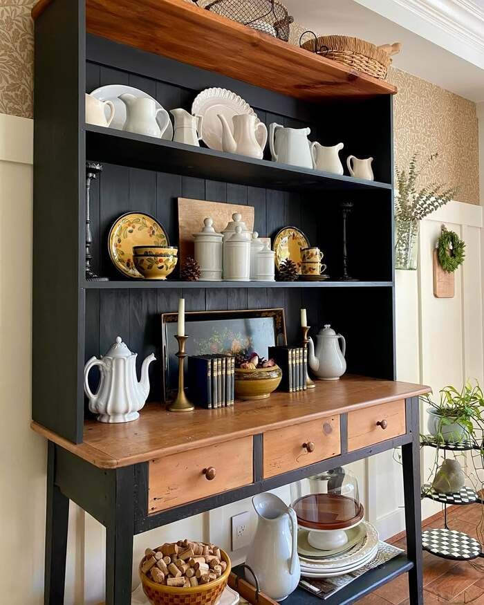Also, you could even hang a seasonal sign or rustic art piece above the hutch, like the “GROCERY” sign in the second image. It instantly gives the space a personality while contributing to the overall cozy charm.