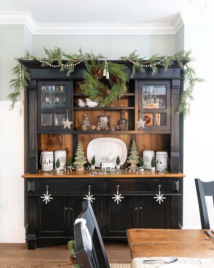 If you're not into the over-the-top Christmas vibe but still want to bring in some holiday magic, consider this black hutch with wintery decor elements. Black furniture can be a bit daunting, but when paired with silver, white, and pinecone accents, it creates a stunning contrast that exudes sophistication.