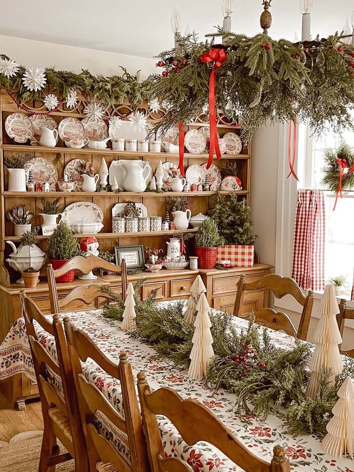 If you want to lean into the farmhouse style, consider this hutch as a perfect example of how to bring rustic holiday charm into your dining room. The warm wood tones, soft pastels, and simple decorations create a cozy environment for family gatherings. Notice the wreaths and subtle holiday decor on the top of the hutch, and how the plates are neatly stacked with just a few holiday accents.