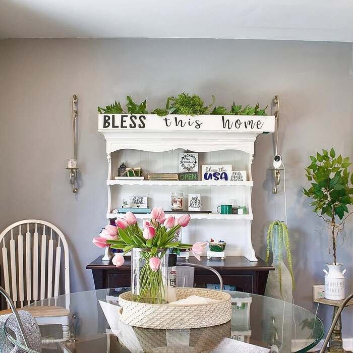 Start by adding a few white dishes, vases, and some bright florals to create a fresh feel. Small plant pots can also add life to your hutch without cluttering the space. I’d recommend incorporating a few hand-lettered signs with inspirational phrases, like “Hello Spring,” to bring personality into the look. The addition of a wooden shelf bracket above gives this hutch the perfect rustic touch that blends well with a more modern aesthetic.