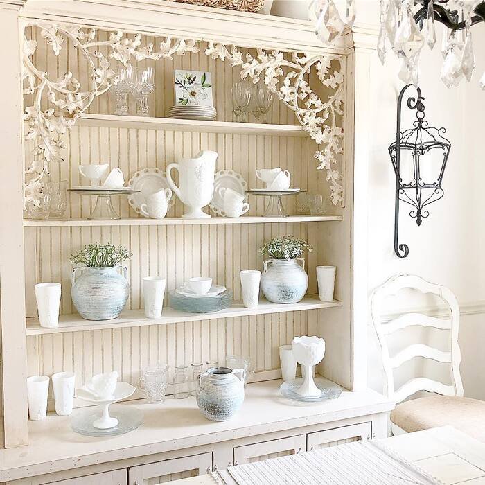 The best part about this design is how it uses pastel florals to create a cohesive and soothing look. To recreate this, I suggest incorporating vintage white ceramics with floral accents. Displaying simple yet elegant glassware in pastel shades will also enhance the overall effect. Adding a soft string of lights on the top of the hutch, as shown here, will not only brighten the space but add a romantic touch. Whether it’s for spring or any time of year, this soft, inviting style is perfect for creating a cozy atmosphere that is both elegant and understated.