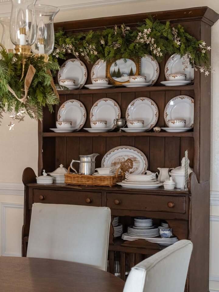 This dark wood hutch is straight-up classic. The plates are displayed like they matter, and they do. The greenery across the top makes it feel festive, but not loud. The star garland is tiny and delicate, so it adds sparkle without yelling. This is dining room shelf decor that feels like family dinners, even if you mostly eat pizza.