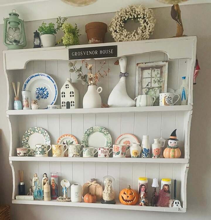 This white wall rack is the kind of dining room shelf decor that feels like somebody actually lives there. The plates and mugs aren’t all matchy-matchy, and that’s the charm. You’ve got patterns, little florals, a goose statue that’s weirdly adorable, and a sign up top that makes it feel like a collected set, not random clutter. I also notice the tiny seasonal touches, like the pumpkin figure and the little spooky pieces. It’s playful without screaming “theme party.”